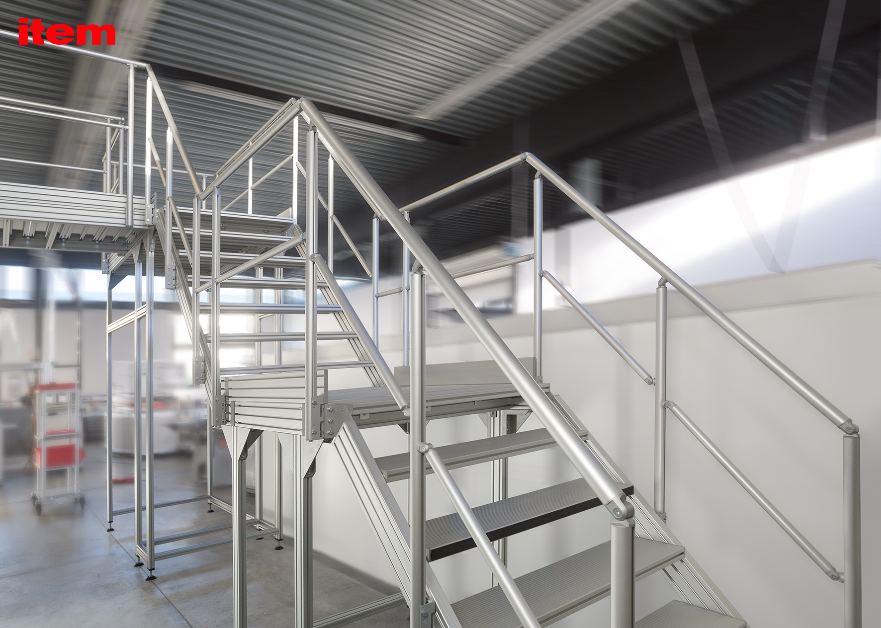 Stairways with steps that feature a rise of 170 mm, a going of 290 mm and a pitch of around 30° are deemed particularly safe. In this white paper, item outlines the basic aspects that should be taken into account at the design stage. In addition to a consistent rise, elements such as adequate step width, anti-slip surfaces and optimum staircase lighting are key to achieving safe stairway designs. Other crucial steps include configuring ideal guard-rails and factoring in maximum weight loads. There are special safety requirements to consider when it comes to stepladders with pitches over 45°. Modular stairway systems such as the item Stairway/Platform System combine the most demanding safety requirements with maximum versatility. Stairways with pitches from 30° to 60° and profiles in variable lengths can be easily adapted to particular specifications. Guard-rails and platforms can also be added to the stairway as appropriate. This means that, depending on the available space and the intended use of the stairway, customers can select the ideal solution for easily and quickly designing bridges, maintenance landings for elevated machine areas, and all-round working platforms.
