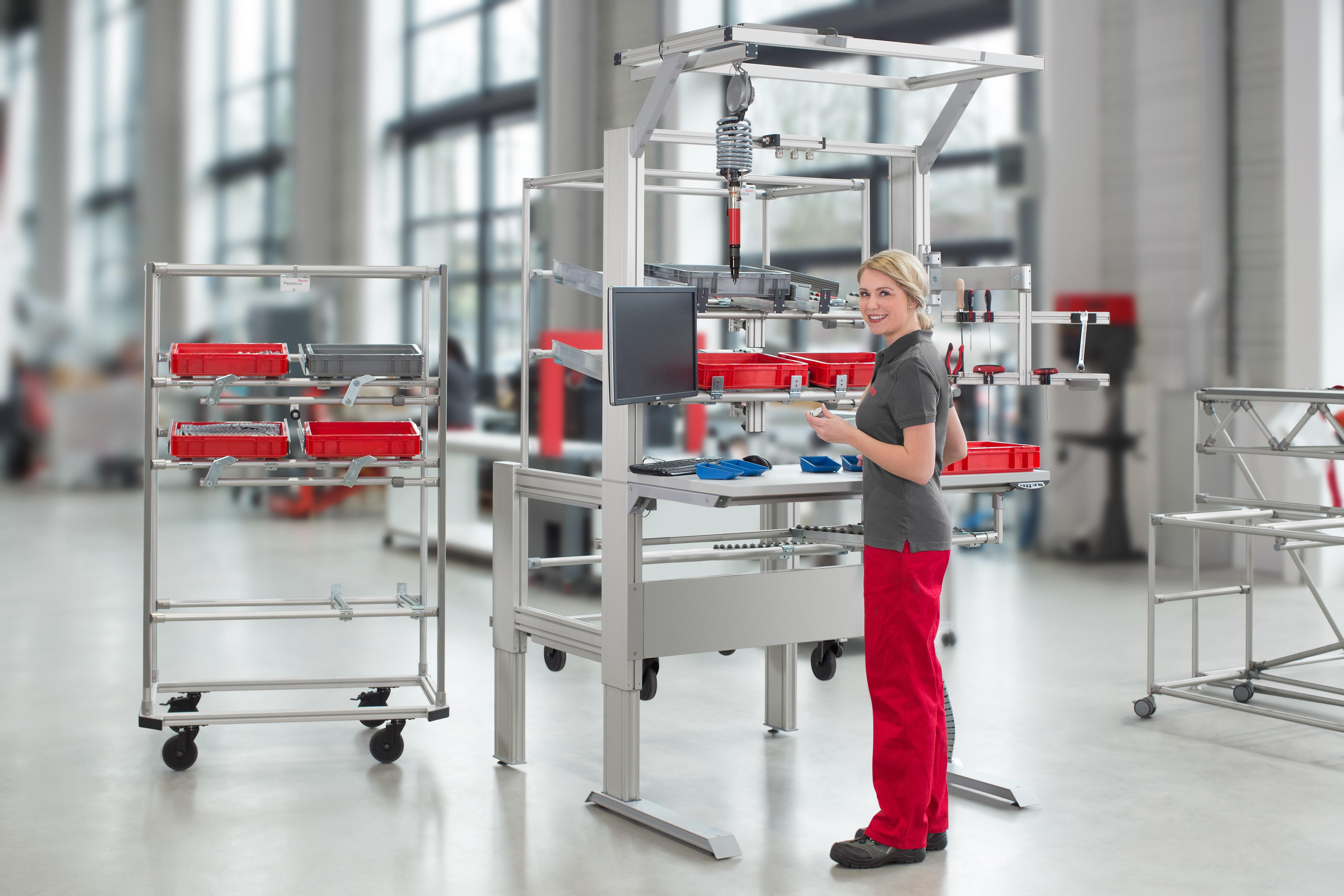 Besides promoting the use of digital technologies, the era of Industry 4.0 is stimulating the demand for flexibility and adaptable production structures. The 4E FIFO Shooter from item offers a workstation that keeps set-up times to a minimum and ensures working processes are efficient. To create this solution, a work bench has been combined with a material supply trolley. The mobile material supply rack can be swapped for another, pre-stocked rack in just a few seconds. Workers restock the workstation from the rear with a little help from Karakuri/LCA. Once the material supply trolley is slotted into place, the locking mechanisms on the inclined roller conveyors release automatically and the containers placed on the conveyors slide right into reach. This ensures material supply is completely customised. As the work bench is electrically height adjustable, it can be ergonomically adapted to the height of the user.