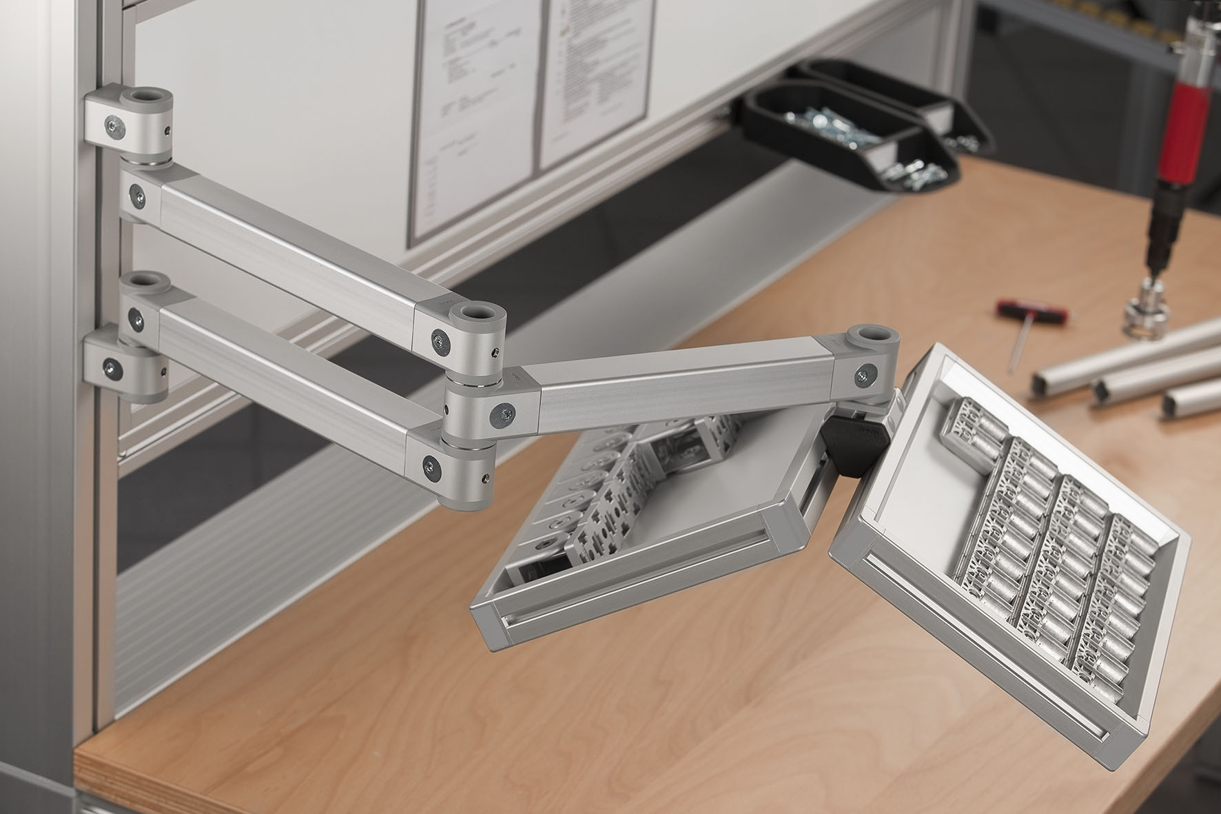 item Pivot Arms and Double Pivot Arms 8 ensure that tools, containers, trays and other resources can be made available at work benches in an ergonomic configuration to suit the user’s specific requirements. The item Work Bench System offers Friction Joints that can be adapted quickly and easily to account for individual needs and different working scenarios, without having to make any compromises on safety. The friction torque can be adjusted with absolute precision so that the Pivot Arm can be moved ergonomically and without much effort while nevertheless remaining stable and staying in the required position. The perfect balance of Pivot Arm 8 ensures ergonomic handling for employees and a reliable hold. If required, the resistance can be adjusted, as users are not tied to a fixed friction torque. If people with different ergonomic requirements working in different shifts are using the same work bench, for example, the friction can be flexibly altered.
