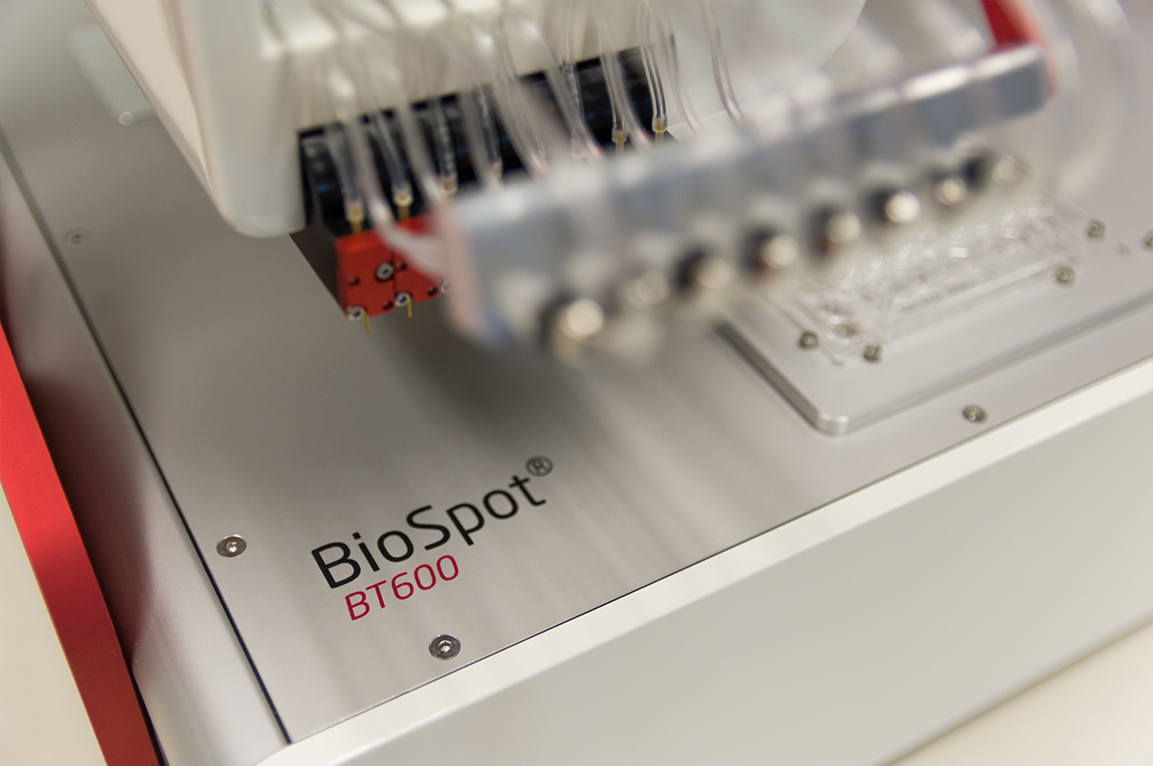 Caption 2: The BioSpot workstation combines various dispensing technologies on a single automated platform. Depending on customer requirements, the devices are built to unique specifications and vary in length – which is no problem, thanks to the flexibility of the item building kit system.