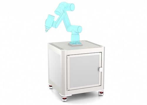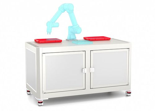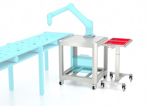 EX-01586The compact workstation for robot arms has a central cable feed-through between two worktops with continuous grooves. This makes it very easy to connect cobots with End Connectors at the bottom. The cobot can be positioned along the passage to suit the task.
